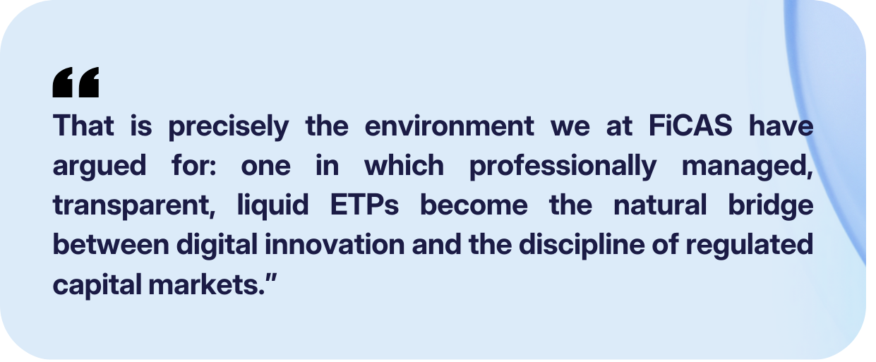 For a Swiss-based crypto-asset manager and ETP issuer such as FiCAS, this evolution is constructive. It rewards firms that established institutional-grade processes early and reduces uncertainty around cross-border distribution, product innovation, and custody.
